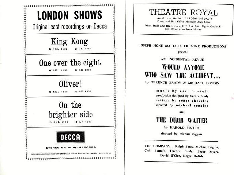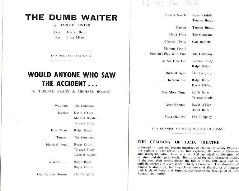 | Multi-part Production | Would Anyone Who Saw the Accident (Terence Brady and Michael Bogdin) and The Dumb Waiter |